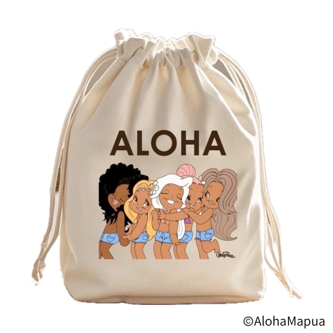 Aloha Mapuaから爽やかな「ナチュラル巾着」が登場しました!可愛らしいAlohaGirls5人がプリントされたこの巾着は、小物やコスメなどを収納するのに最適です。