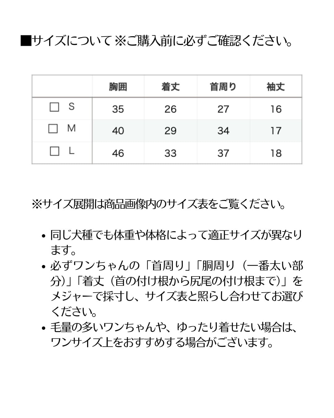 * 毛量の多いワンちゃんや、ゆったり着せたい場合は、ワンサイズ上をおすすめする場合がございます。