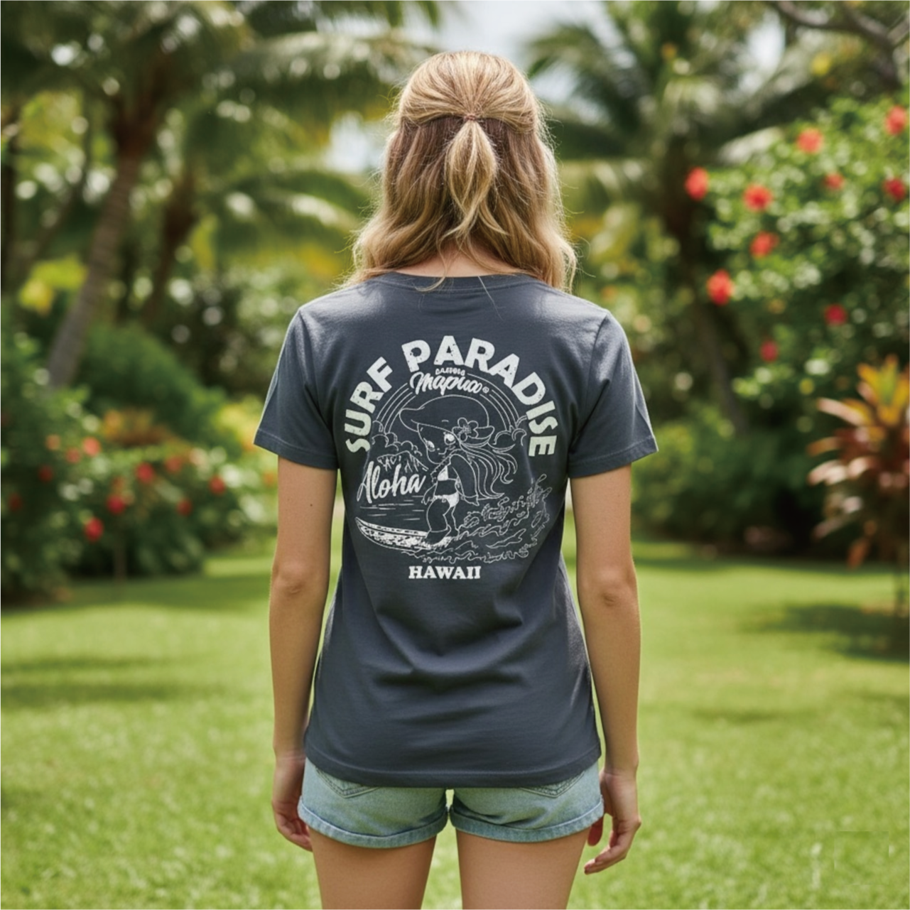 "SURF PARADISE T-shirt" Denim is a Hawaii-themed T-shirt that is perfect for summer. This T-shirt features a Mapua is enjoying surfing and will make you feel the summer sun and sea breeze.